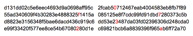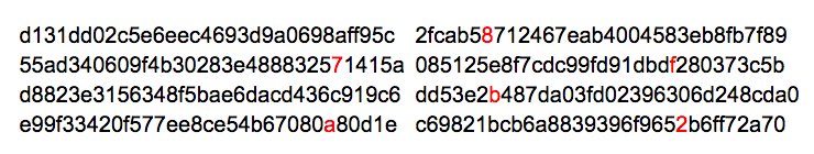 Ben Laurie has a nice website that visualizes this MD5 collision. For a non-technical, though slightly outdated, introduction to hash functions, see Steve Friedl’s Illustrated Guide. And here’s a good article from DFI News that explores the same topic.