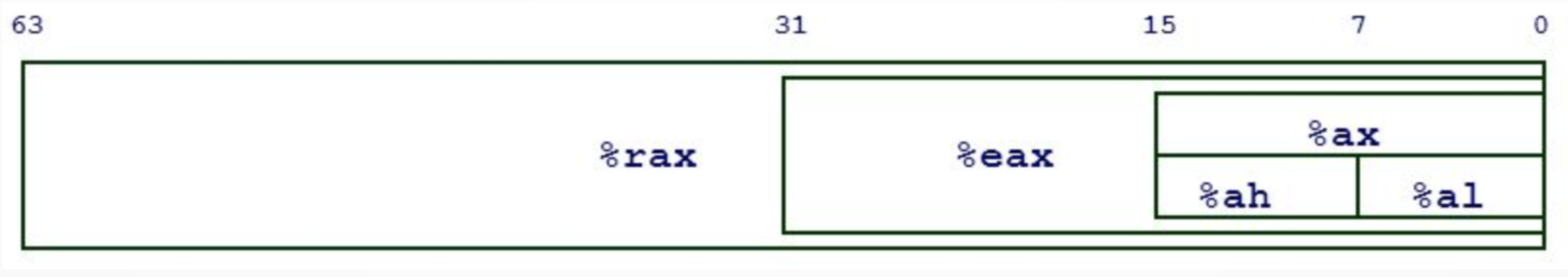 x86-64 registers behave similarly to other architectures. A key component of x86-64 registers is multi-sized access which means the register RAX can have its lower 32 bits accessed with EAX. The next lower 16 bits can be accessed with AX and the lowest 8 bits can be accessed with AL which allows for the compiler to make optimizations which boost program execution.